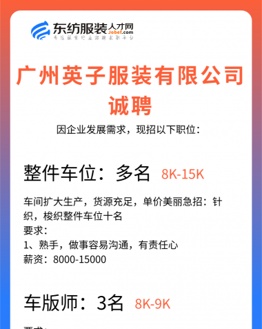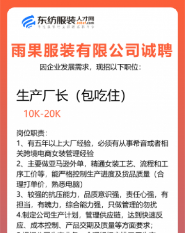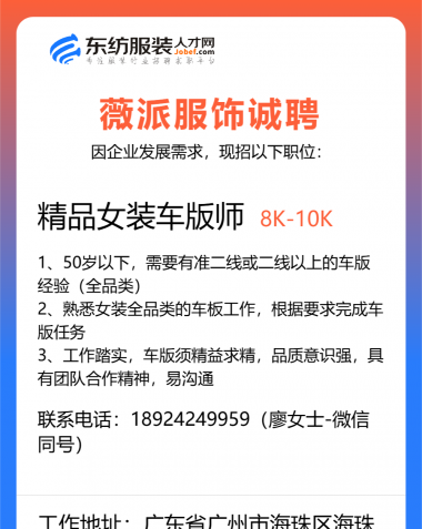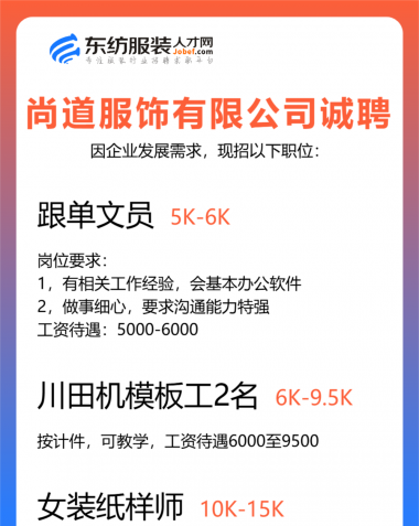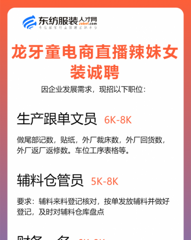 职位:主设计师/服装设计师/女装设计师/设计助理/车间主管/生产厂长/主管/生产经理/收发/中查/尾查/尾部专员/财务文员/财务/会计/时尚买手/库管员/跟单文员