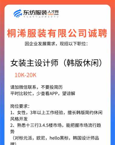 职位:服装设计师/首席设计师/主设计师/设计总监/女装设计师/设计助理/生产跟单