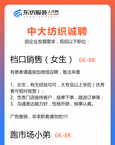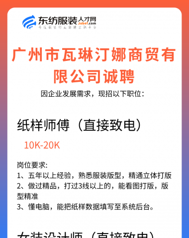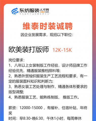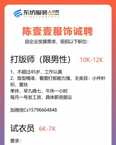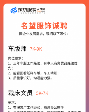 职位:纸样师/打版师/车间主管/车间组长/指导工/外发主管/采购/采购主管/采购助理/电商运营