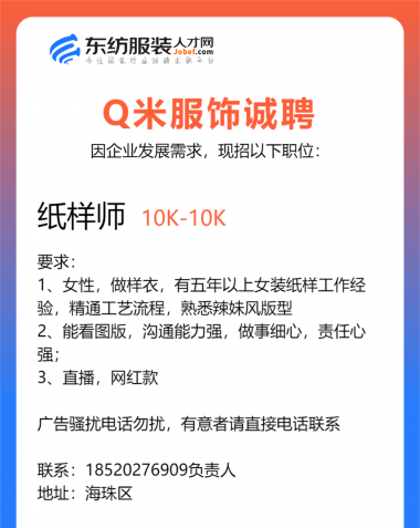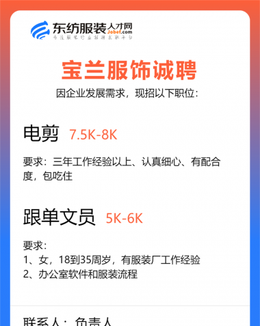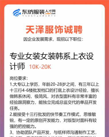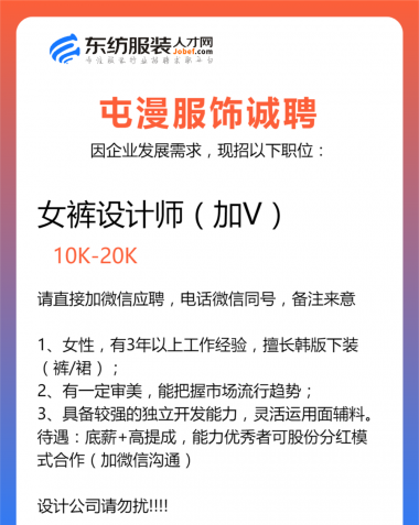 职位:服装设计师/主设计师/女装设计师/设计助理/车版师/样衣工/纸样师/打版师/办公室文员/仓库专员