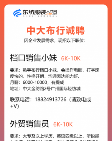 职位:仓库文员/仓库专员/市场小弟/普工/财务/会计/财务文员/纺织工艺/营业员/销售员/前台/开单文员/销售/业务员/销售助理/店长助理/电商美工/平面设计/收货/拿货专员/库管员/外贸销售跟单