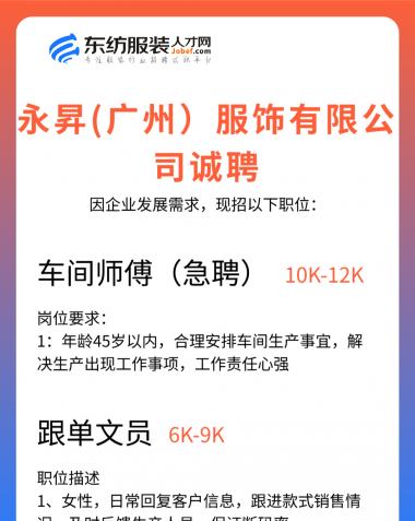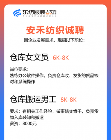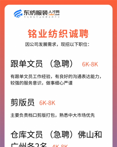 职位:营业员/销售员/开单文员/收货/拿货专员/面料检验/验布员/库管员/销售/业务员/市场小弟/仓库主管/生产跟单/跟单文员