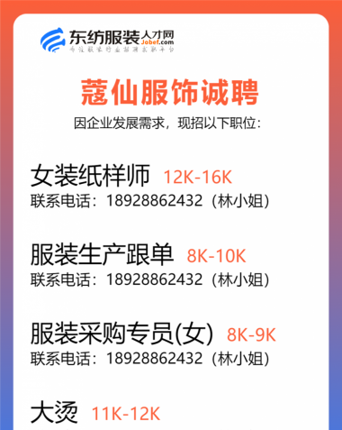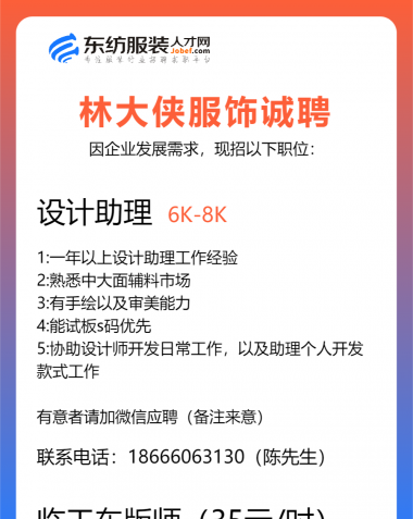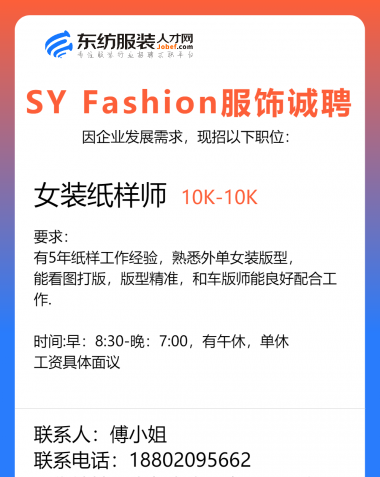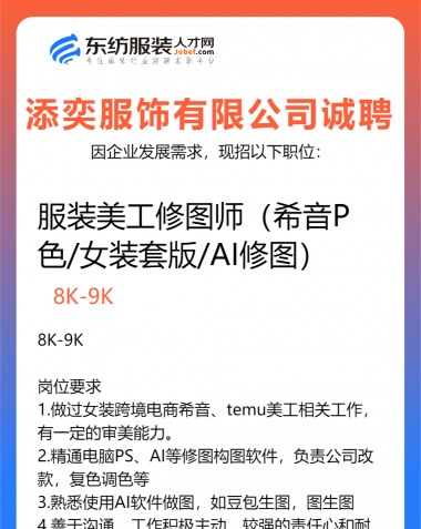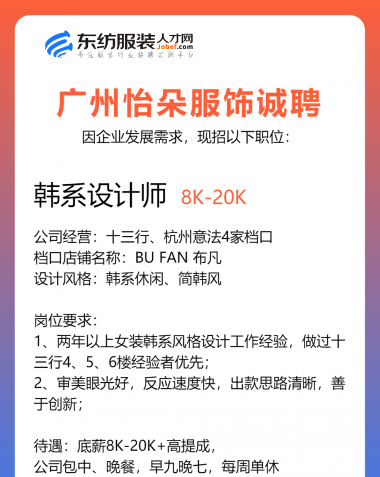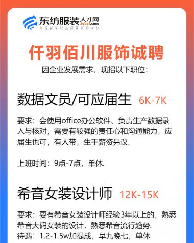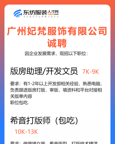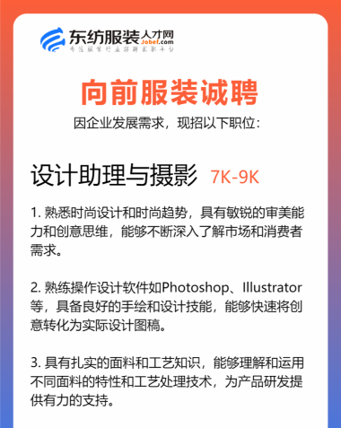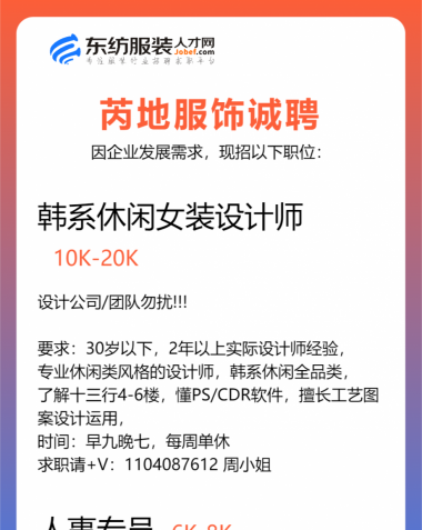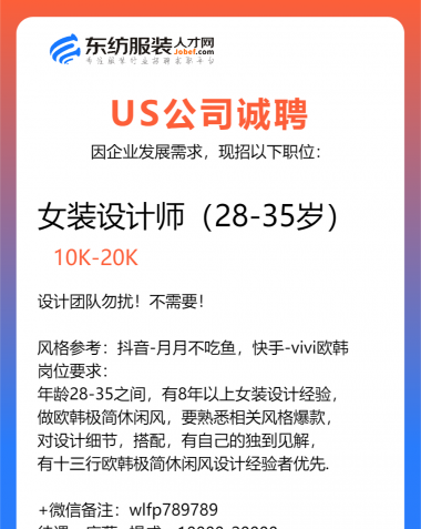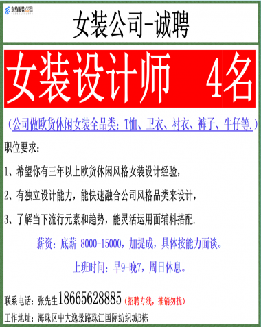 职位:女装设计师/主设计师/服装设计师/图案设计师/平面设计师/生产跟单/外发主管/花型/图案设计/电商美工/平面设计