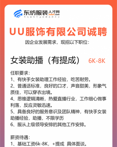 职位:/女装设计师/设计助理/主设计师/服装设计师/运营助理/电商运营/电商客服/网络推广/销售助理/外贸销售跟单/销售/业务员/财务/会计/财务文员/电商主播/试衣模特