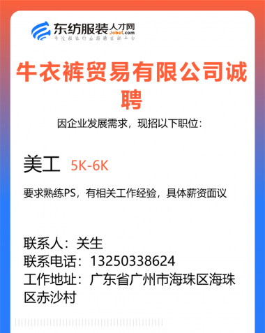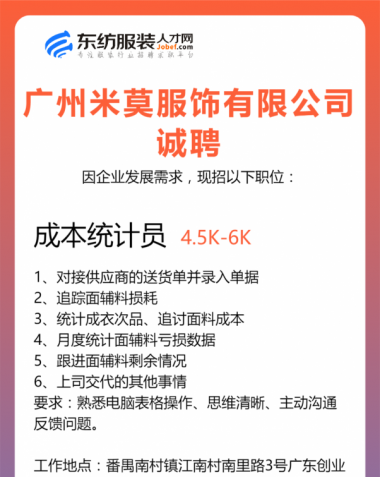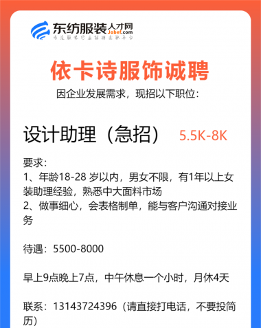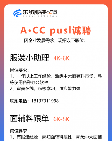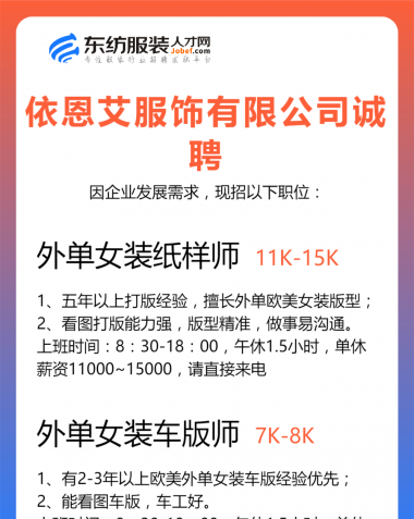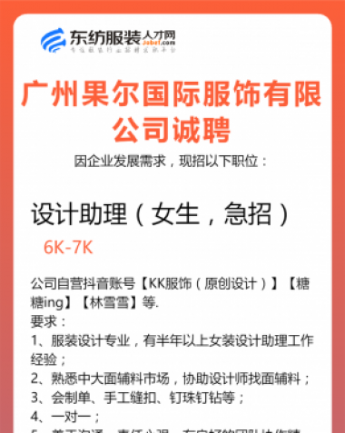 职位:服装设计师/主设计师/女装设计师/设计助理/车版师/样衣工/纸样师/打版师/办公室文员/仓库专员