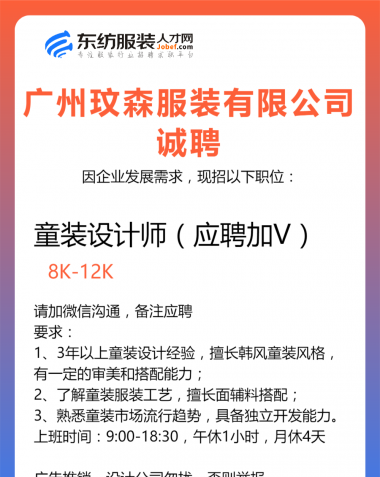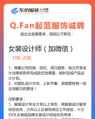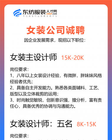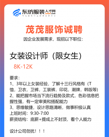 职位:服装设计师/主设计师/女装设计师/首席设计师/设计总监/设计助理/毛织设计师/车版师/样衣工//查货/QC质检/生产跟单