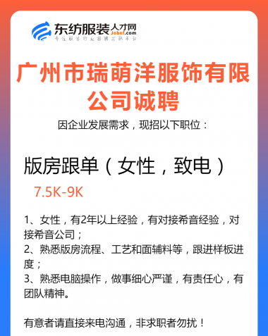 职位:版房助理/生产跟单/纸样助理/学徒//外贸跟单/跟单助理/跟单文员