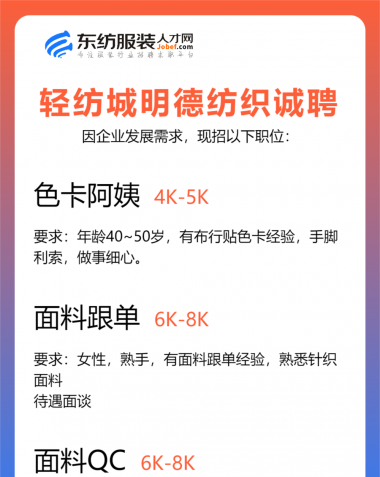 职位:品质管理/QA/面料检验/面料检验/验布员/面辅料跟单员/打卷员/开单文员/QC质检/普工/营业员/销售员