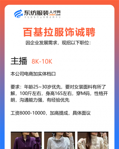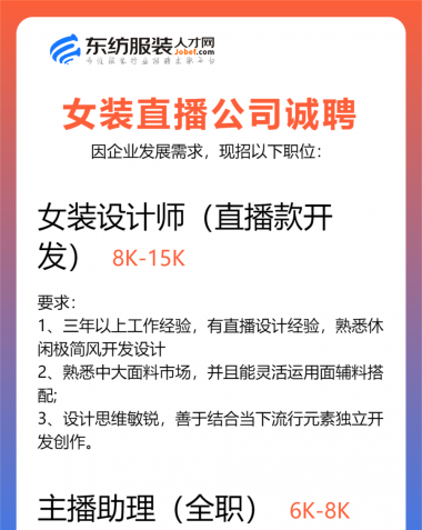 职位:服装设计师/主设计师/女装设计师/助播/副播/场控/中控/电商主播