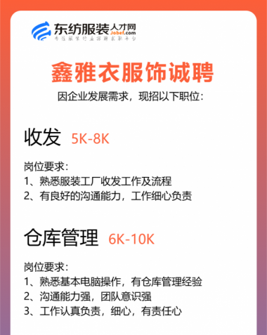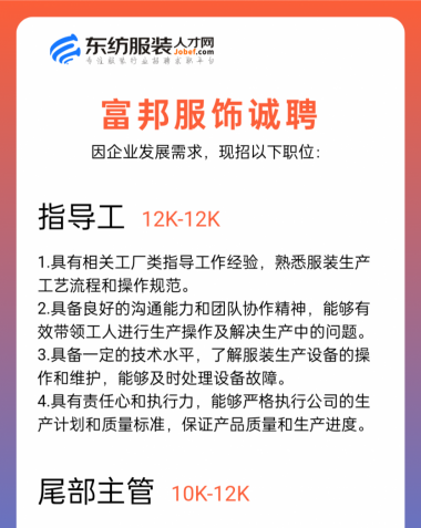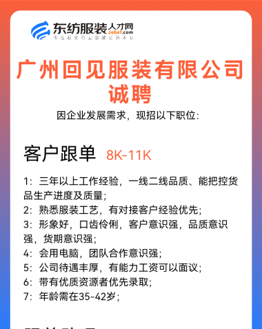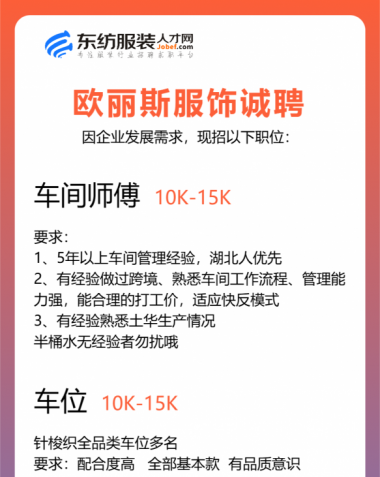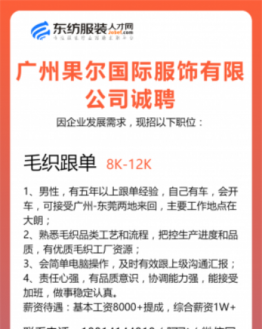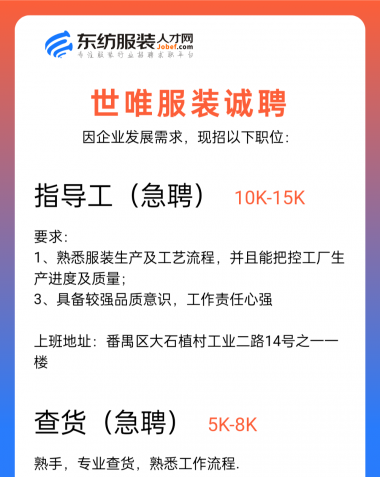 职位:主设计师/服装设计师/女装设计师/设计助理/车间主管/生产厂长/主管/生产经理/收发/中查/尾查/尾部专员/财务文员/财务/会计/时尚买手/库管员/跟单文员/生产跟单