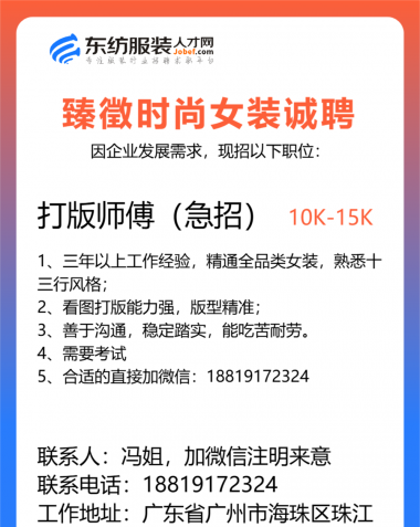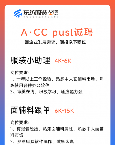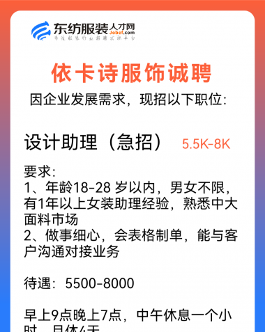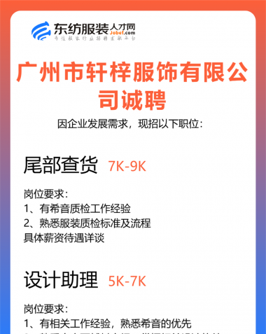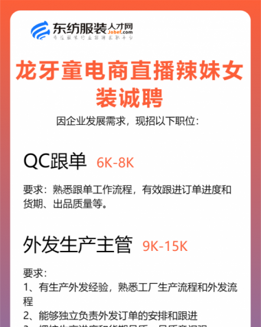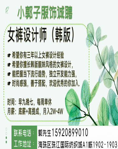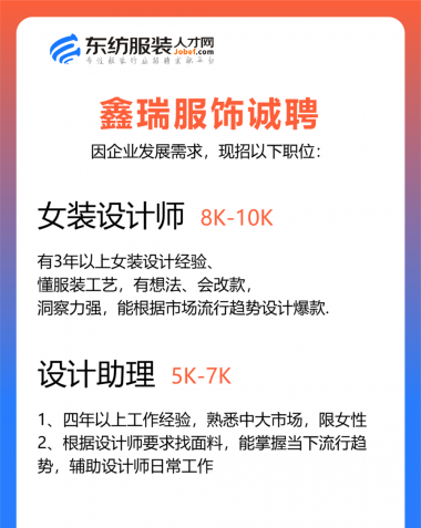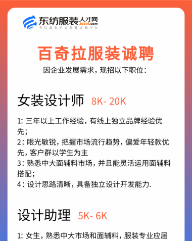 职位:服装设计师/设计助理/女装设计师/试衣模特/QC质检//查货/电商运营经理/总监