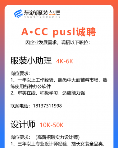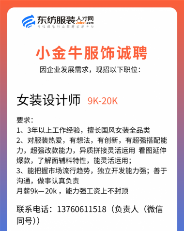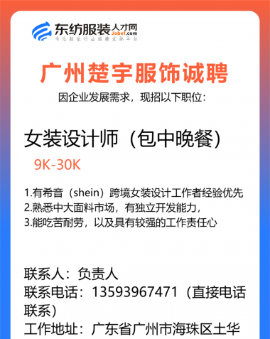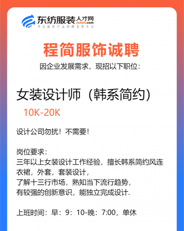 职位:女装设计师/纸样师/打版师/跟单文员/服装设计师/首席设计师/主设计师/设计总监/生产跟单