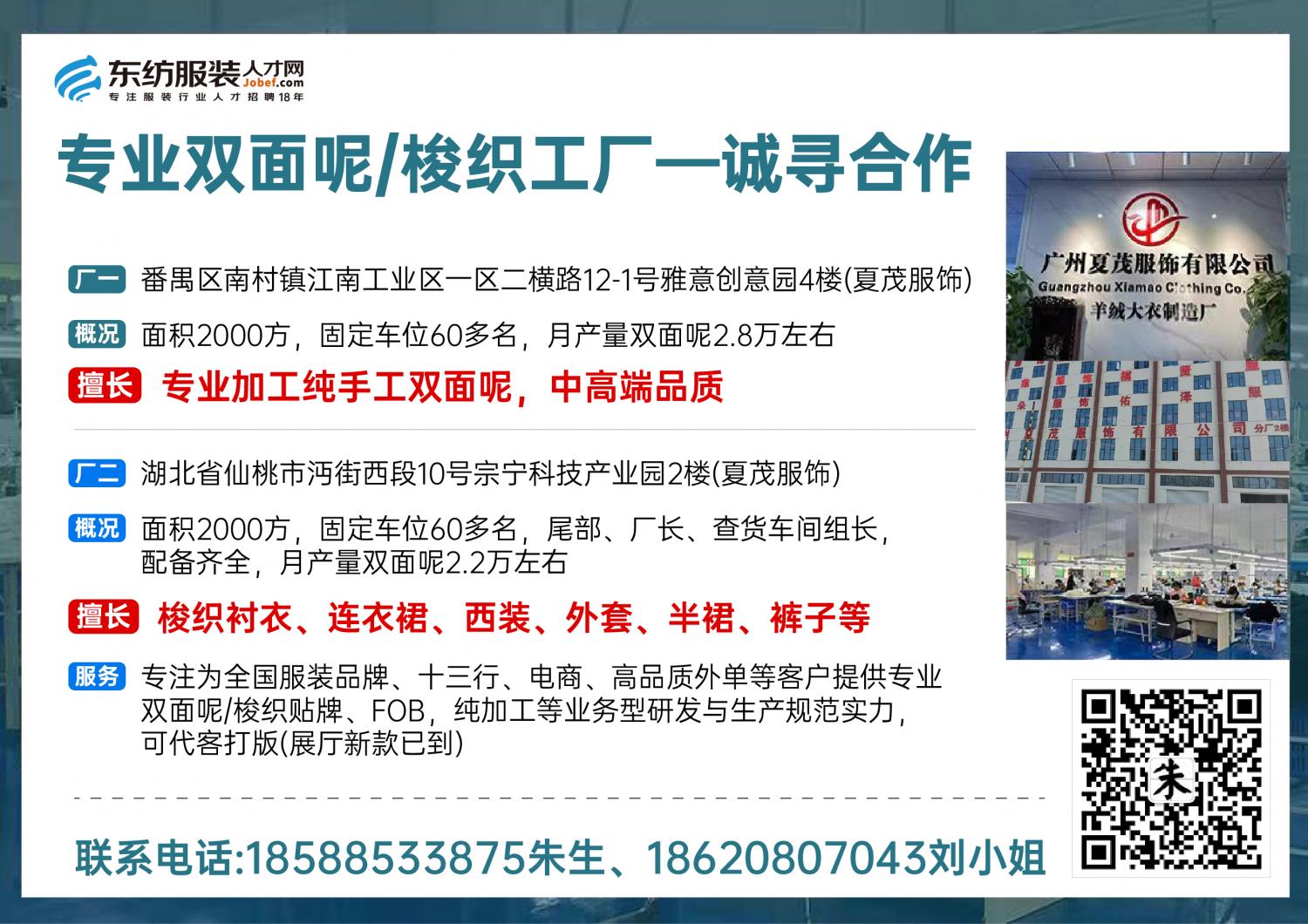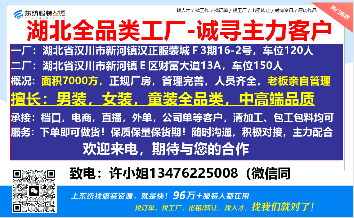 地址:南村镇江南工业区一区二横路12-1号雅意创意园4楼(夏茂服饰)/湖北省仙桃市沔街西段10号宗宁科技产业园2楼