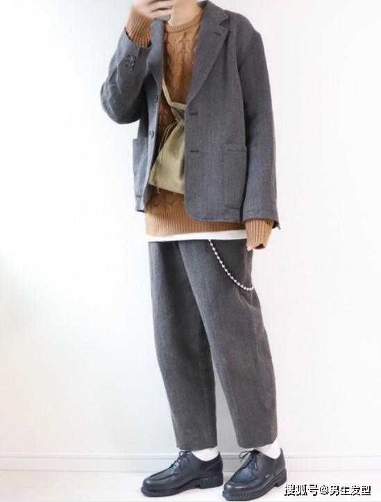 在冬天少不了要穿一件避寒的衣服,而棕色的毛衣刚好舒适又保暖。像这样的灰色休闲西装,小编就不太建议搭配颜色比较亮的内搭了,否则就会破坏了整体穿搭的调性。肩上再挎个单肩包,妥妥的小年轻!