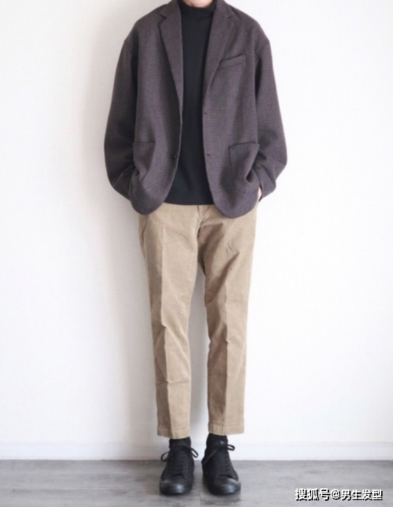 想要在时尚感和成熟感之间找一点平衡,棕色休闲西装搭配黑色的T恤就很可以,卡其色的裤子保持了年轻的气质,整个搭配满满的轻熟感!天气寒冷,如果再搭配一条围巾,走在街上,你就是妥妥的男神了!