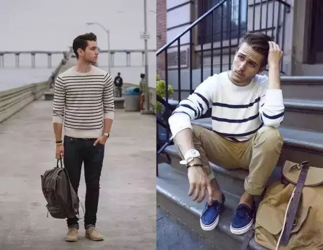 至于条纹衫的搭配,最好是以牛仔裤或是卡其色裤子为主,显得沉稳有气质~