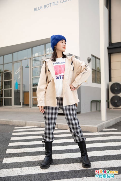 这样的一身搭配,质感浪漫又时髦,同时不失少年人的活泼可爱范,米色半大款呢子外套,内搭白色印花T恤,搭配一条黑白格纹长裤,黑色马靴对比,活泼又庄重,有版有型。