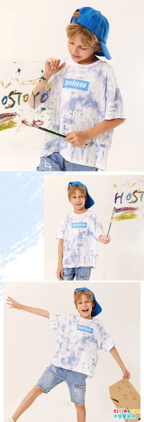 泼洒的水彩图案带来视觉上的冰凉感,再搭一条宽松牛仔裤,清爽又自在。